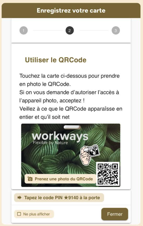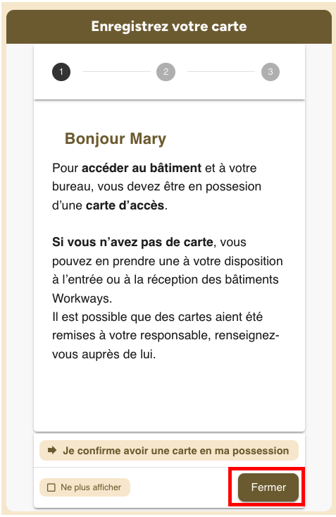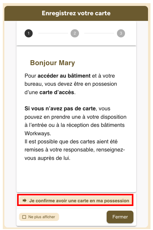 Si vous cliquez sur le lien Enregistrer ma carte (surligné en vert ci-dessus) ou que vous vous connectez à l’application Workways, vous serez guidé à travers les étapes 1 à 3 pour compléter l’enregistrement de votre carte d’accès.