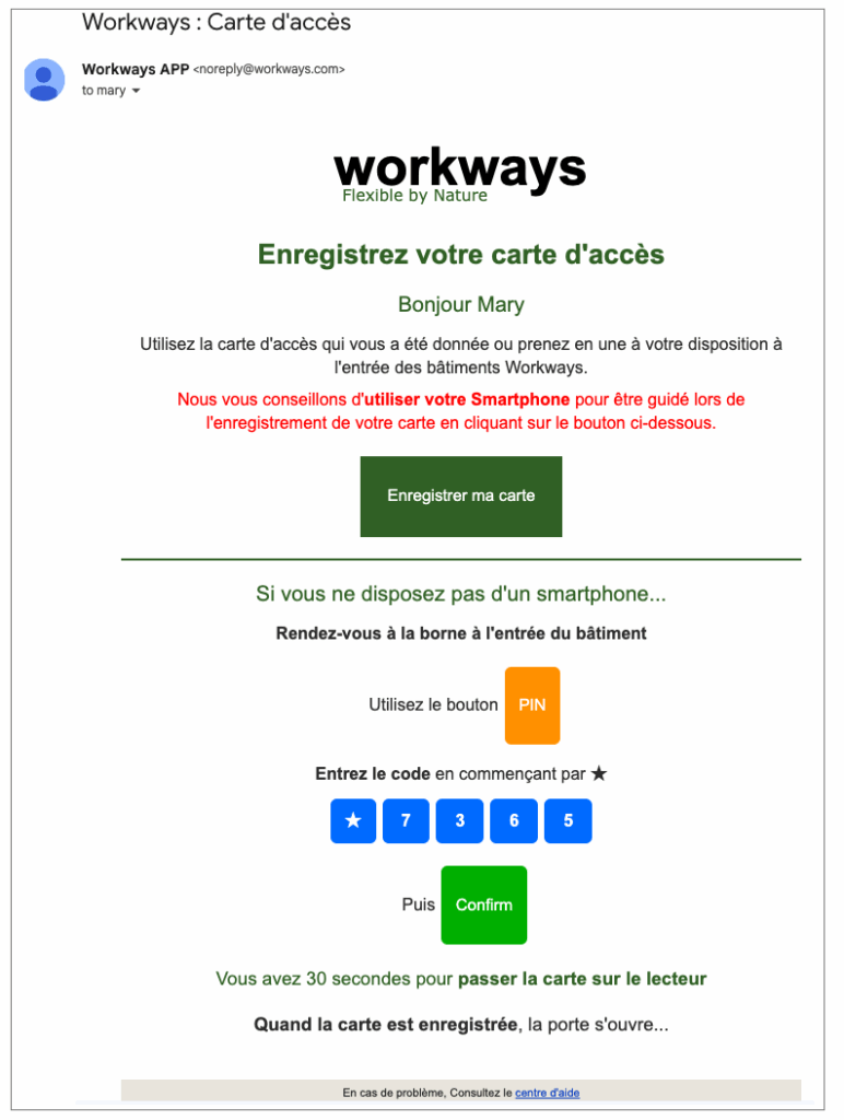 Vous recevrez cet email si vous cliquez sur le bouton Fermer à l’étape 1 ou à l’étape 2 – c’est-à-dire si vous interrompez le processus d’enregistrement de votre carte d’accès.