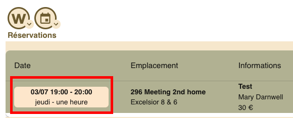 Quand la réservation est enregistrée, elle est affichée dans la liste des réservations.