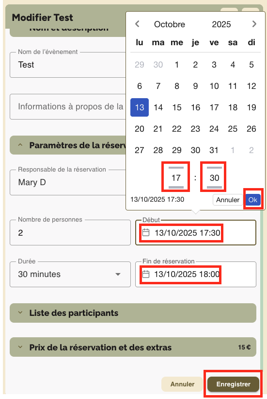 Vous pouvez modifier les heures de début et de fin de réservation.