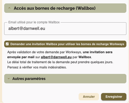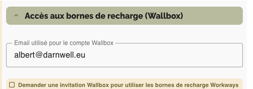 Il peut être différent quand le mail de l’application Workways n’est pas réel (vous ne pouvez pas y accéder avec un client de messagerie) ou que vous avez déjà un compte Wallbox.
